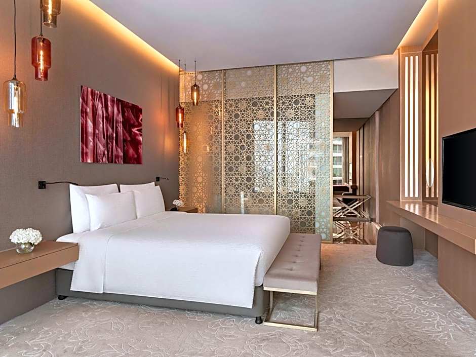 Our comfortable and stylish Deluxe Rooms offer a floor-to-ceiling views of the city and side sea view. Spacious rooms ranging from 37 to 48 square yards offer a large double bed, a seating area with a 48-inch LED flat panel TV. The private bathroom offers a bathtub, a standalone shower. We also have 4 handicapped rooms which are fully equipped for safety and comfort. Please note that in Rixos Premium Dubai, smoking in rooms are strictly prohibited.